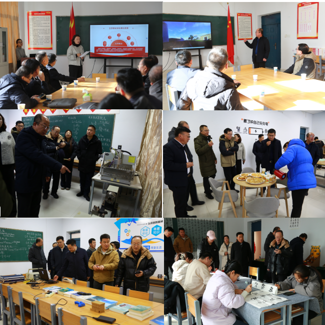 观摩团一行依次参观了学院“党建文化长廊”七大主题功能室。在美育活动室,学生们正在写春联,现场为来宾送上“福”字与对联;在劳动教育活动室,烘焙与茶艺专业的同学奉上亲手制作的点心和奶茶,收获“点赞”不断。随后,观摩团走进党员活动室,王晶书记以“党建引领、德技并修”为主线介绍学院整体做法,张溥理事长补充汇报了盛乐校区实训中心规划及“党建+产教融合”实践路径。